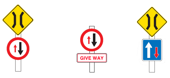 A blue rectangular sign with a white arrow indicating priority for oncoming traffic
